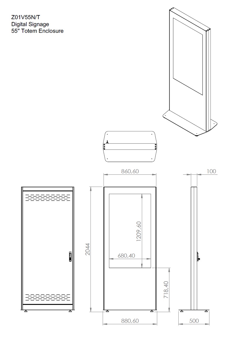 Indoor Stele Portrait, 55" Bildschirm, schwarz ohne Monitor, Metall-Aluminium, Sicherheitsglas