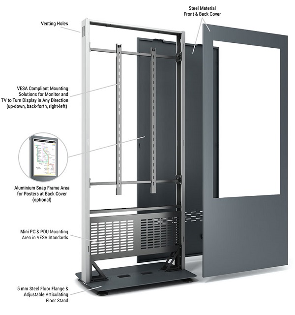 Indoor Stele Portrait, 49" Bildschirm, ohne Monitor, Metall-Aluminium, Vesa Halterung,