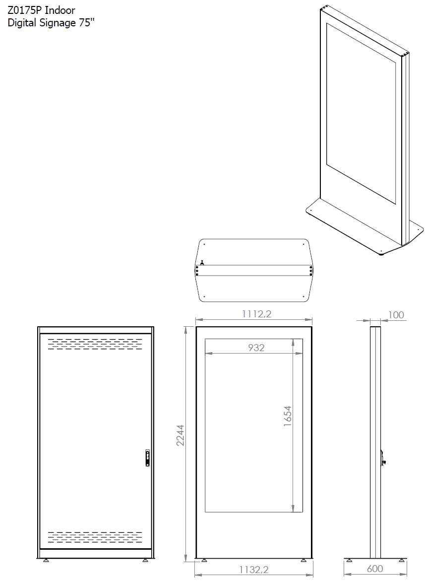 Indoor Stele Portrait, 75" Bildschirm, schwarz ohne Monitor, Metall-Aluminium, Sicherheitsglas