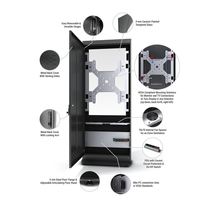 4mm, abschliessbar, Universal Vesa Halterung, Edelstahlfüsse höhenverstellbar, Rücköffnung