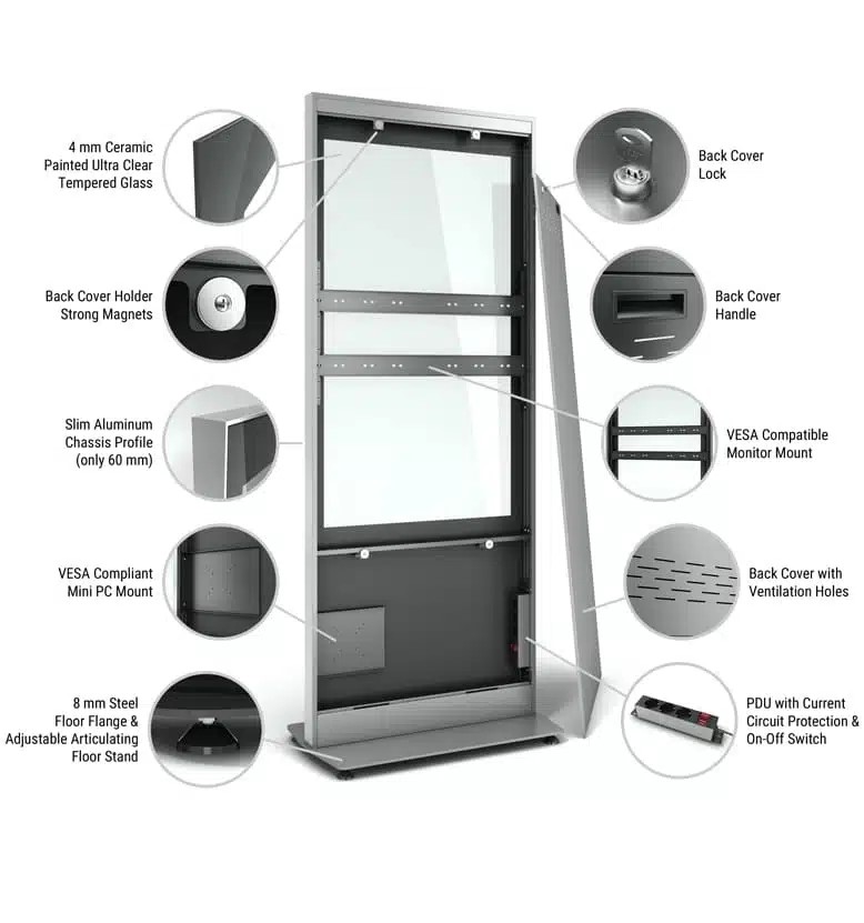 Indoor Stele Portrait, 55" Bildschirm, 4mm Glas, Ultra Slim 6cm, ohne Monitor, Metall-Aluminium,