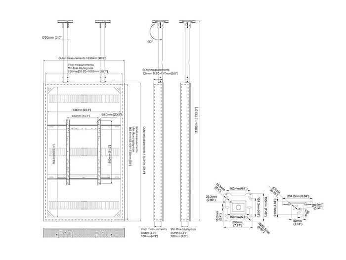 Monitor Rahmen, Deckenmontage, 75"/9109 High Brightness Tiefe einstallbar bis108mm