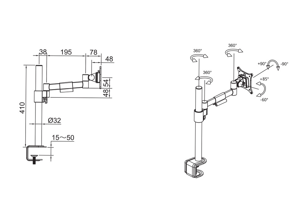 bar 360°, neigbar +85/-60°, Tischklammern