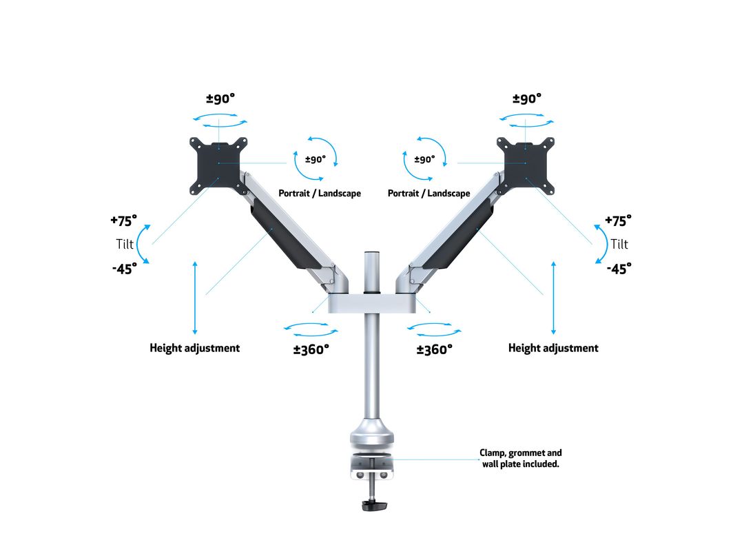 Monitorhalter Duo 32", Metall, rotierbar 90° VESA 100x100, min.2x2kg - max.2x10kg, silber