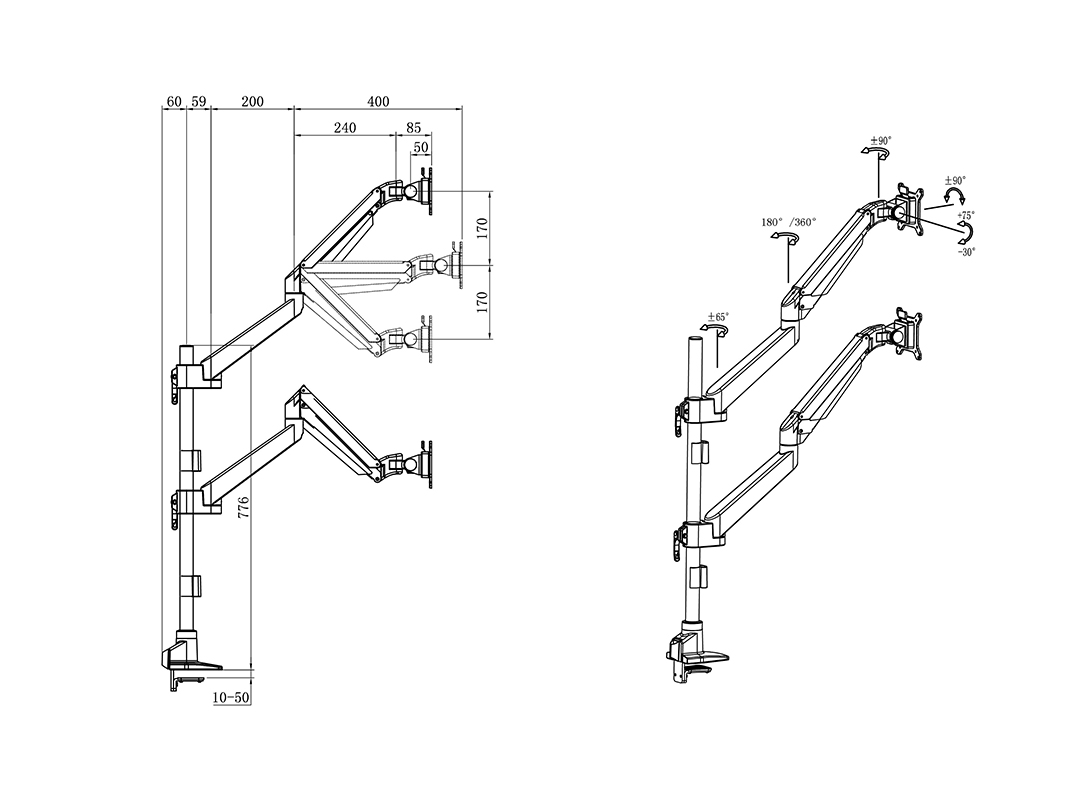 3 Gelenke 2 Gas-Arme, Ausleger bis 595 mm,