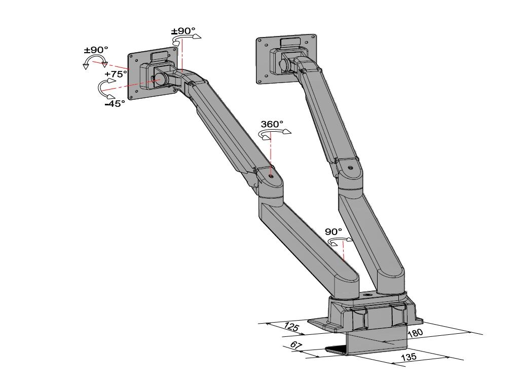 3 Gelenke 2 Arm, Neigung +75/-45°, höheen-