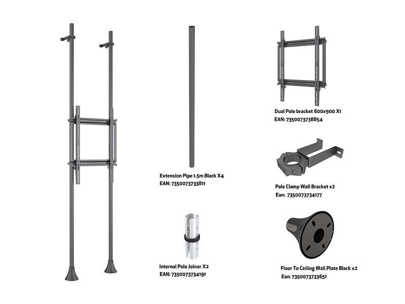 Boden-Wandhalter mit Dopperrohr, VESA 200x 200-600x900, schwarz, max 125 kg, 65"-100"