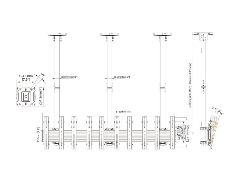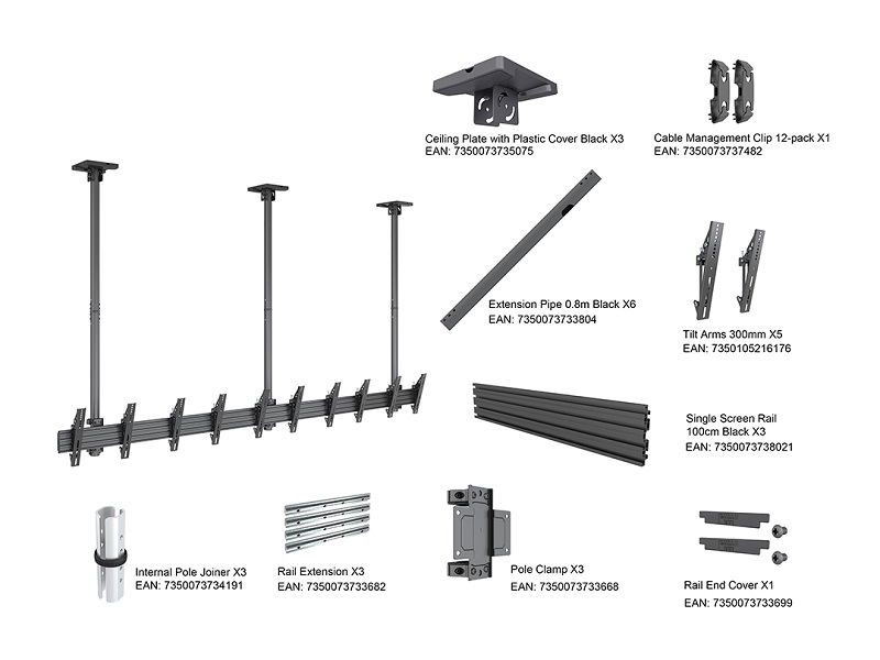 Deckenhalter 5x, 32"- 50", schwarz, VESA 100x 100-300x300, Stahl/Aluminium, max 5x30 kg