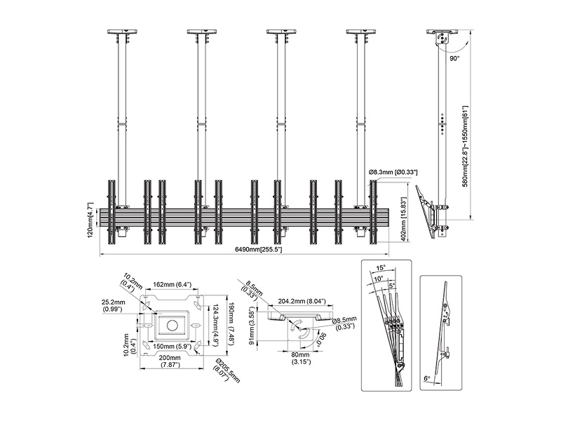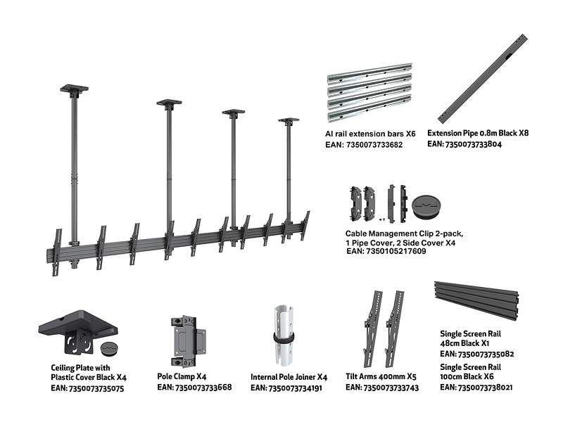 Deckenhalter 5x, 40" - 65", schwarz, VESA 100x 100-600x400, Stahl/Aluminium, max 5x30 kg