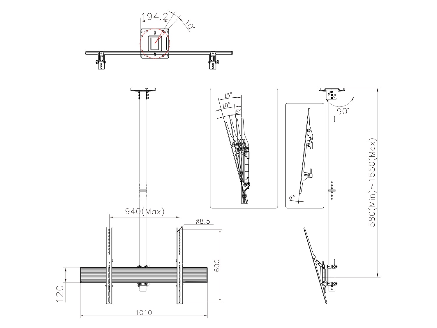 Deckenhalter, 40" - 100", schwarz, max 135 kg VESA100 -900x600, Stahl/Aluminium, neigbar15°