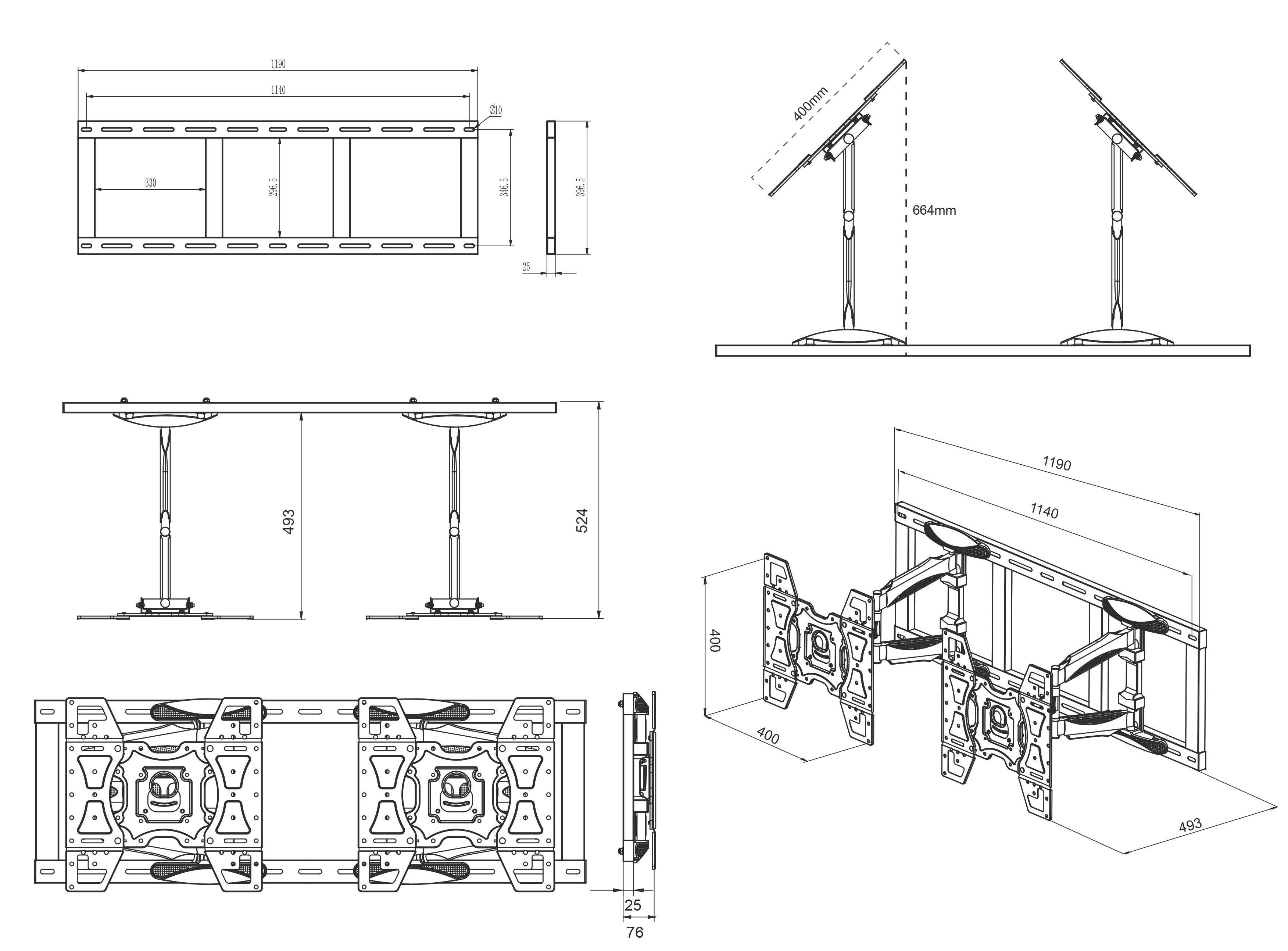 beide Halter am selben Rahmen,1190x493x76mm, Kabelmanagement, inkl. Montageset