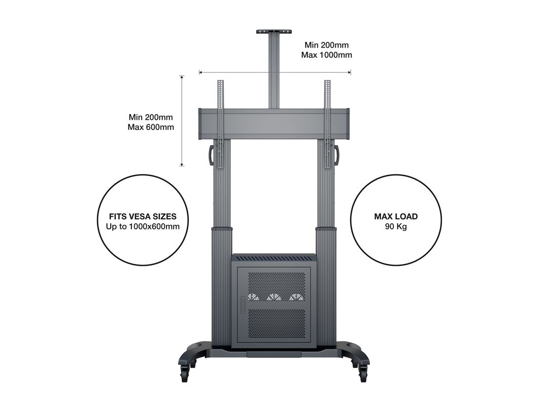 Standfuss manuell, -100", max 90 kg, schwarz VESA 1000x600, Höhe1390 -1740mm, Softrollen
