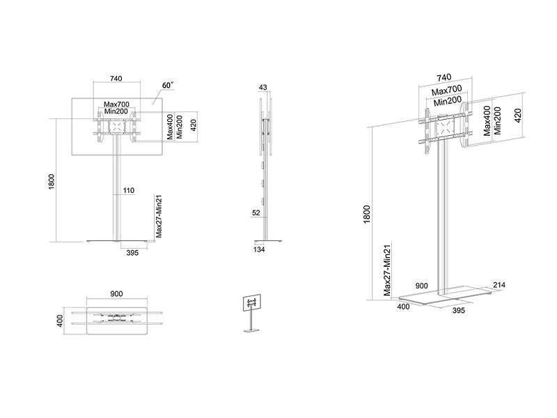 TV Ständer B2B -65", Metall/Aluminium, schwarz VESA 700x400, max. 50 kg, Höhe 1800 mm