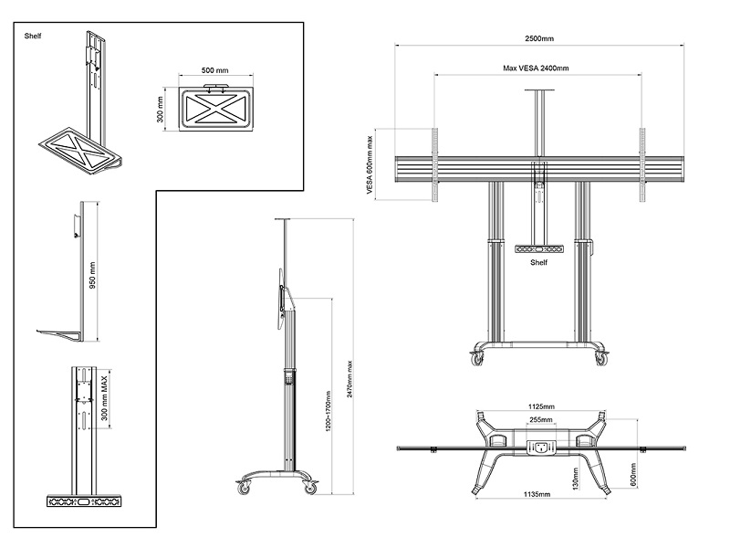 Standfuss elektr. 65-110", max 135 kg, schwarz Vesa 100x100-2400x600, Metall, Hub bis 500mm