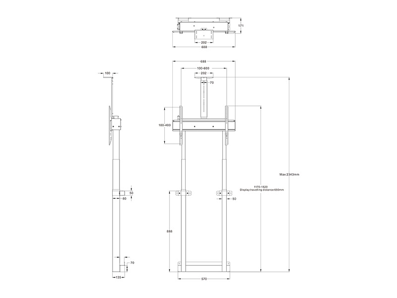 bis 650 mm, Höhe: 1170 -1820mm, Kabel