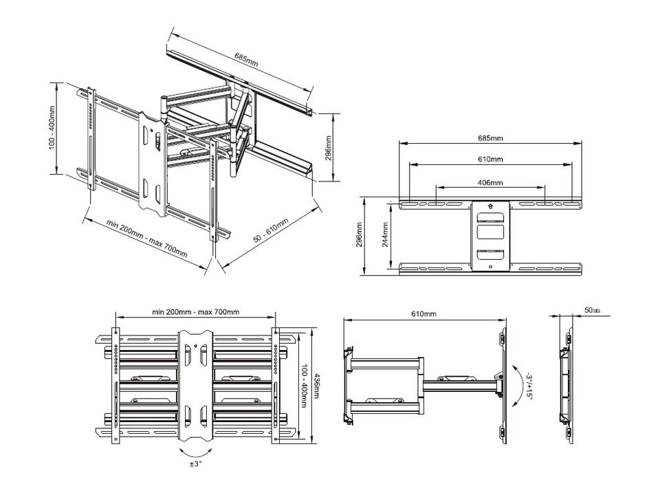 4 Gelenke, Wandabstand mind. 50 max. 610 mm,