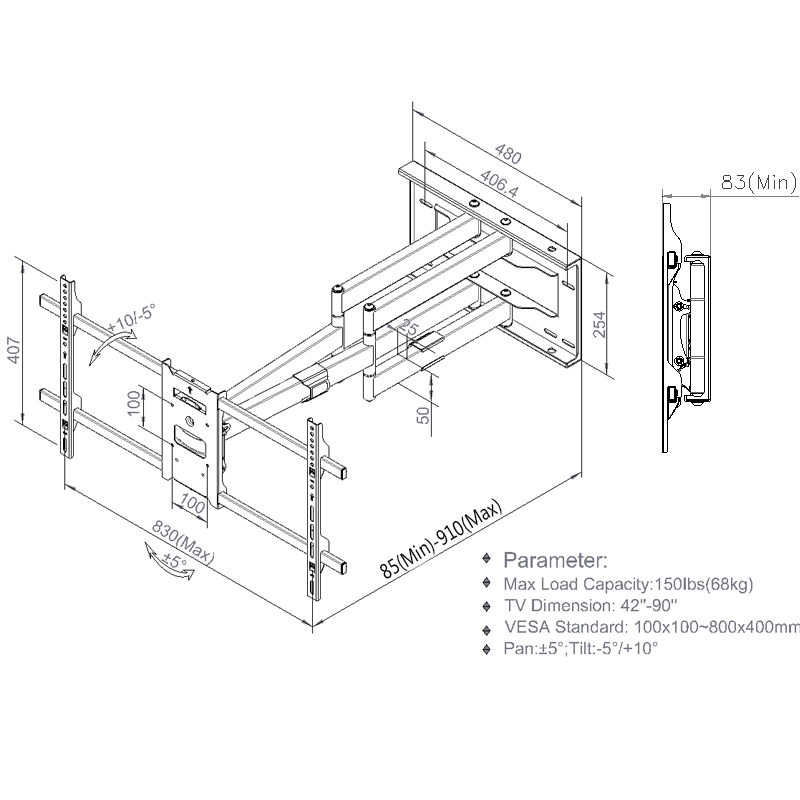 Wandabstand 83mm-910mm, Neigung -5°/+10°,