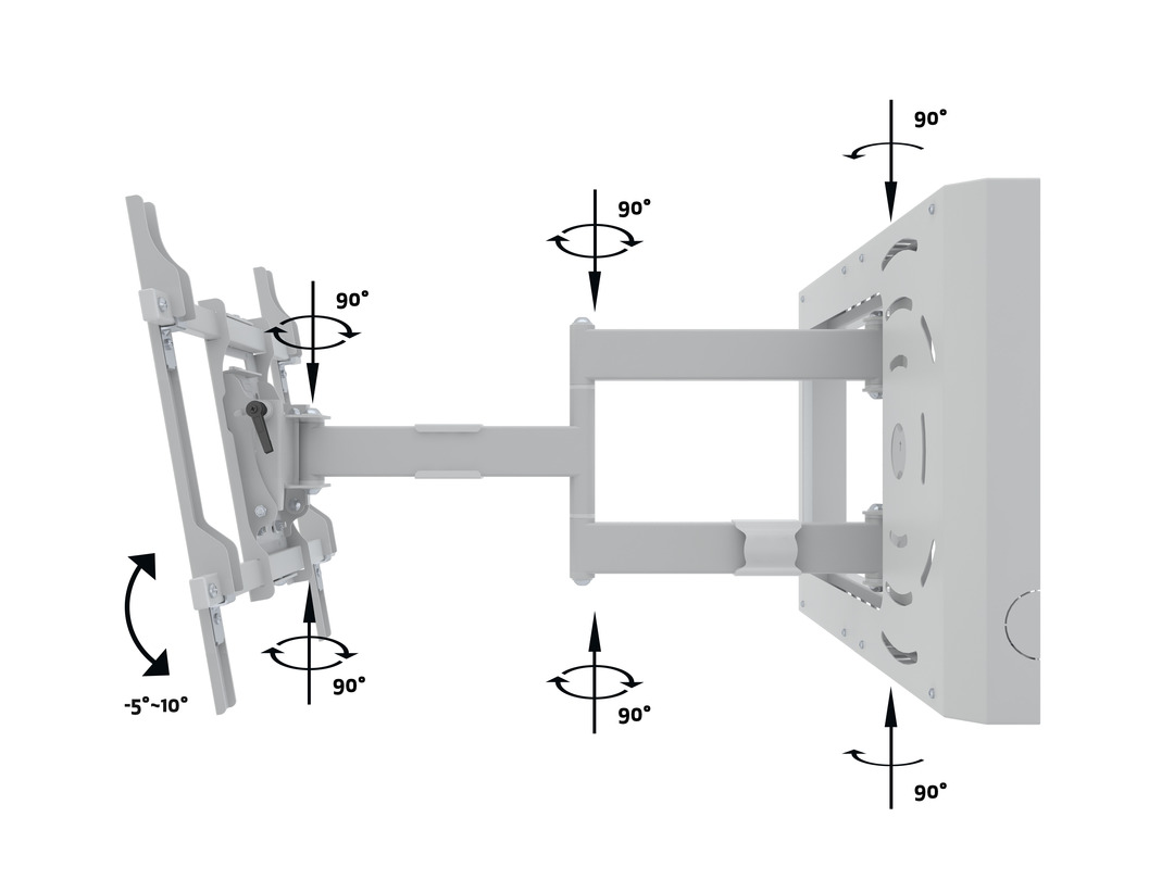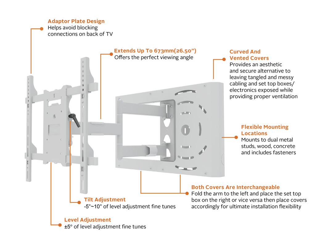 Wandabstand 10-673mm, neigbar -5°-+10°, inkl. Montageset, Screenleveling +/- 5°, mit Stauraum