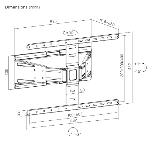 Wandabstand 19.5-250mm, Neigung +3°- -15°,